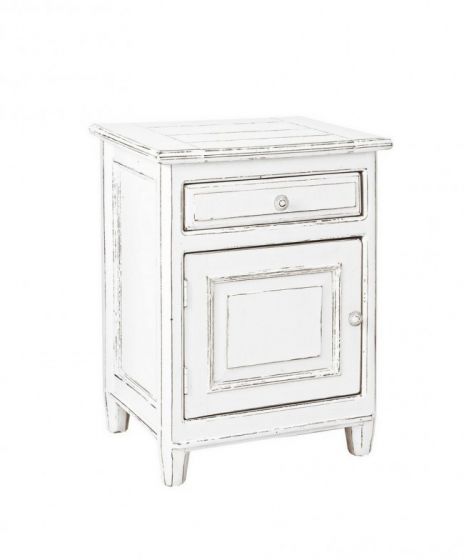 Το προϊόν δεν είναι διαθέσιμο για παραγγελία και θα μπορεί να γίνει παραγγελία μετά από την αναγραφόμενη ημερομηνία.Κομοδίνο κατασκευασμένο από μασίφ ξύλο mango σε αντικέ λευκό χρώμα με ένα συρτάρι και ένα ντουλάπι που ανοίγει προς τα αριστερά.