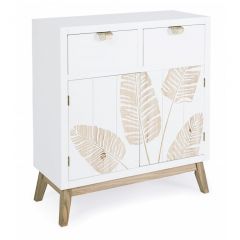 Διαθέτει μεταλλικά χερούλια και δύο συρτάρια από ξύλο παυλωνίας με χειροποίητη διακόσμηση φύλλου.