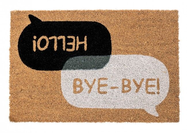 Το προϊόν είναι διαθέσιμο στην αποθήκη μας και αποστέλλεται την ίδια ή την επόμενη ημέρα. Μπορείτε επίσης να το παραλάβετε άμεσα από το κατάστημά μας.Πατάκι εισόδου, από 40% PVC και 60% φυσικές ίνες κοκοφοίνικα, διακοσμημένο με συννεφάκια ομιλίας κόμικ "hello" και "bye-bye".