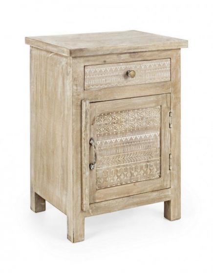 Το προϊόν αποστέλλεται 21-30 ημέρες μετά την παραγγελία ή μπορεί να παραληφθεί από το κατάστημα σε 21-30 ημέρεςΚομοδίνο κατασκευασμένο από ξύλο Mango με χειροποίητα σκαλιστά μοτίβα. Διαθέτει ένα συρτάρι από MDF, ένα ντουλάπι και μπρούτζινα πόμολα.