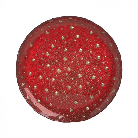 Το προϊόν είναι διαθέσιμο στην αποθήκη μας και αποστέλλεται την ίδια ή την επόμενη ημέρα. Μπορείτε επίσης να το παραλάβετε άμεσα από το κατάστημά μας.Γυάλινη πιατέλα κόκκινου χρώματος διακοσμημένη με χρυσά αστέρια.