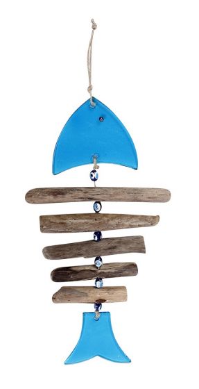 Το προϊόν είναι διαθέσιμο στην αποθήκη μας και αποστέλλεται την ίδια ή την επόμενη ημέρα. Μπορείτε επίσης να το παραλάβετε άμεσα από το κατάστημά μας.Κρεμαστό γούρι-ψαροκόκκαλο από γυαλί γαλάζιου χρώματος και φυσικό ξύλο με ματάκια που μας προστατεύουν από την κακή ενέργεια και να μας φέρνουν καλοτυχία.
