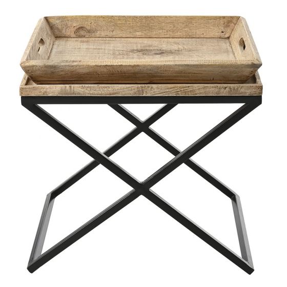 Το προϊόν αποστέλλεται 4-7 ημέρες μετά την παραγγελία ή μπορεί να παραληφθεί από το κατάστημα σε 4-7 ημέρες.Μεταλλικό μαύρο βοηθητικό τραπέζι διαστάσεων 55x45x56 εκατοστά με επιφάνεια και αποσπώμενο δίσκο απο μασίφ ξύλο mango.