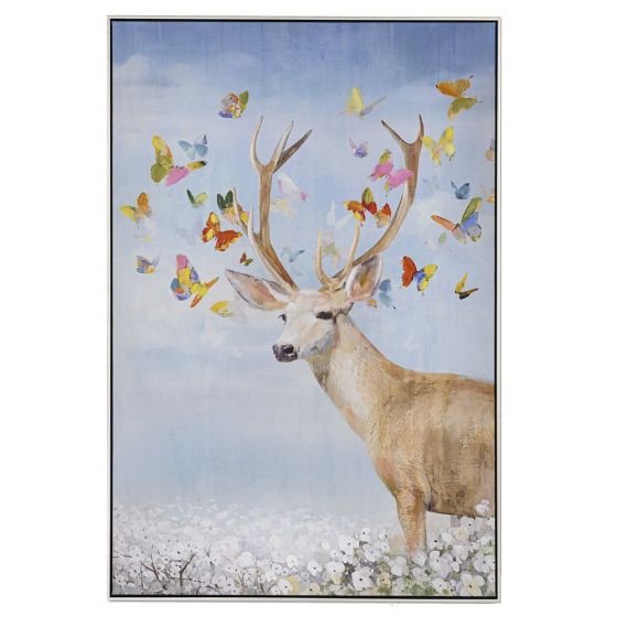 Το προϊόν αποστέλλεται 4-7 ημέρες μετά την παραγγελία ή μπορεί να παραληφθεί από το κατάστημα σε 4-7 ημέρες.Πίνακας υψηλής ποιότητας, 100% χειροποίητη ελαιογραφία πάνω σε τυπωμένο καμβά, που απεικονίζει ένα ελάφι με πολύχρωμες πεταλούδες.