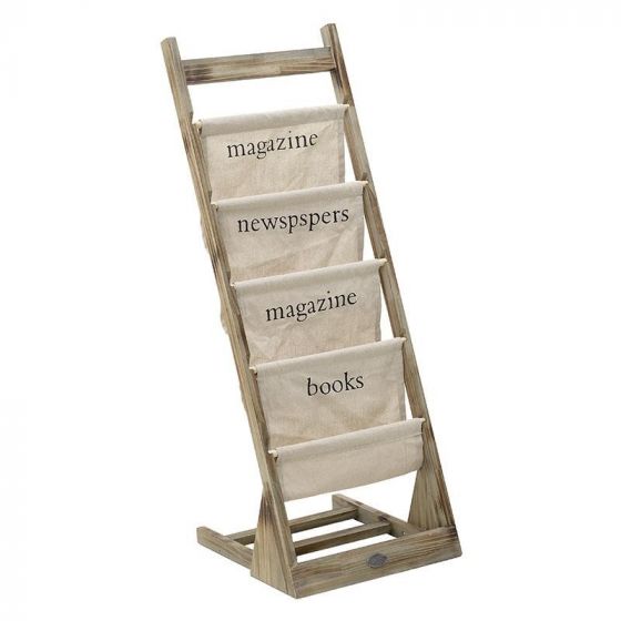 Το προϊόν είναι διαθέσιμο στην αποθήκη μας και αποστέλλεται την ίδια ή την επόμενη ημέρα. Μπορείτε επίσης να το παραλάβετε άμεσα από το κατάστημά μας.Ξύλινη εφημεριδοθήκη σε σχήμα σκάλας με πέντε υφασμάτινες θέσεις για τα περιοδικά και τις εφημερίδες.