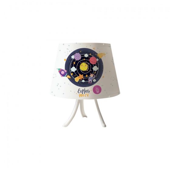 Το προϊόν αποστέλλεται 2-3 ημέρες μετά την παραγγελία ή μπορεί να παραληφθεί από το κατάστημα σε 2-3 ημέρες.Παιδικό επιτραπέζιο φωτιστικό με πλαστική βάση λευκού χρώματος και υφασμάτινο καπέλο με θέμα το διάστημα.