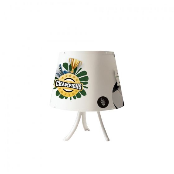 Το προϊόν αποστέλλεται 2-3 ημέρες μετά την παραγγελία ή μπορεί να παραληφθεί από το κατάστημα σε 2-3 ημέρες.Παιδικό επιτραπέζιο φωτιστικό με πλαστική βάση λευκού χρώματος και υφασμάτινο καπέλο με θέμα την ποδοσφαιρική μπάλα.