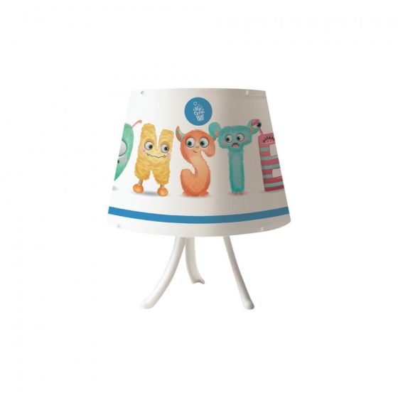 Το προϊόν αποστέλλεται 2-3 ημέρες μετά την παραγγελία ή μπορεί να παραληφθεί από το κατάστημα σε 2-3 ημέρες.Παιδικό επιτραπέζιο φωτιστικό με πλαστική βάση λευκού χρώματος και υφασμάτινο καπέλο με θέμα τα τερατάκια.