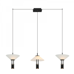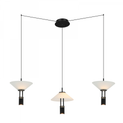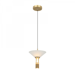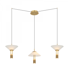Διαθέτει γυάλινους διαχύτες σε σχήνα κώνου και κυλινδρικά σποτάκια στην κάτω πλευρά από αλουμίνιο χρυσού ματ χρώματος.