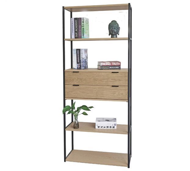 Είναι πολύ ευρύχωρη, αφού διαθέτει τέσσερα ράφια και δύο συρτάρια για να τοποθετήσετε βιβλία, κασπώ και άλλα διακοσμητικά.